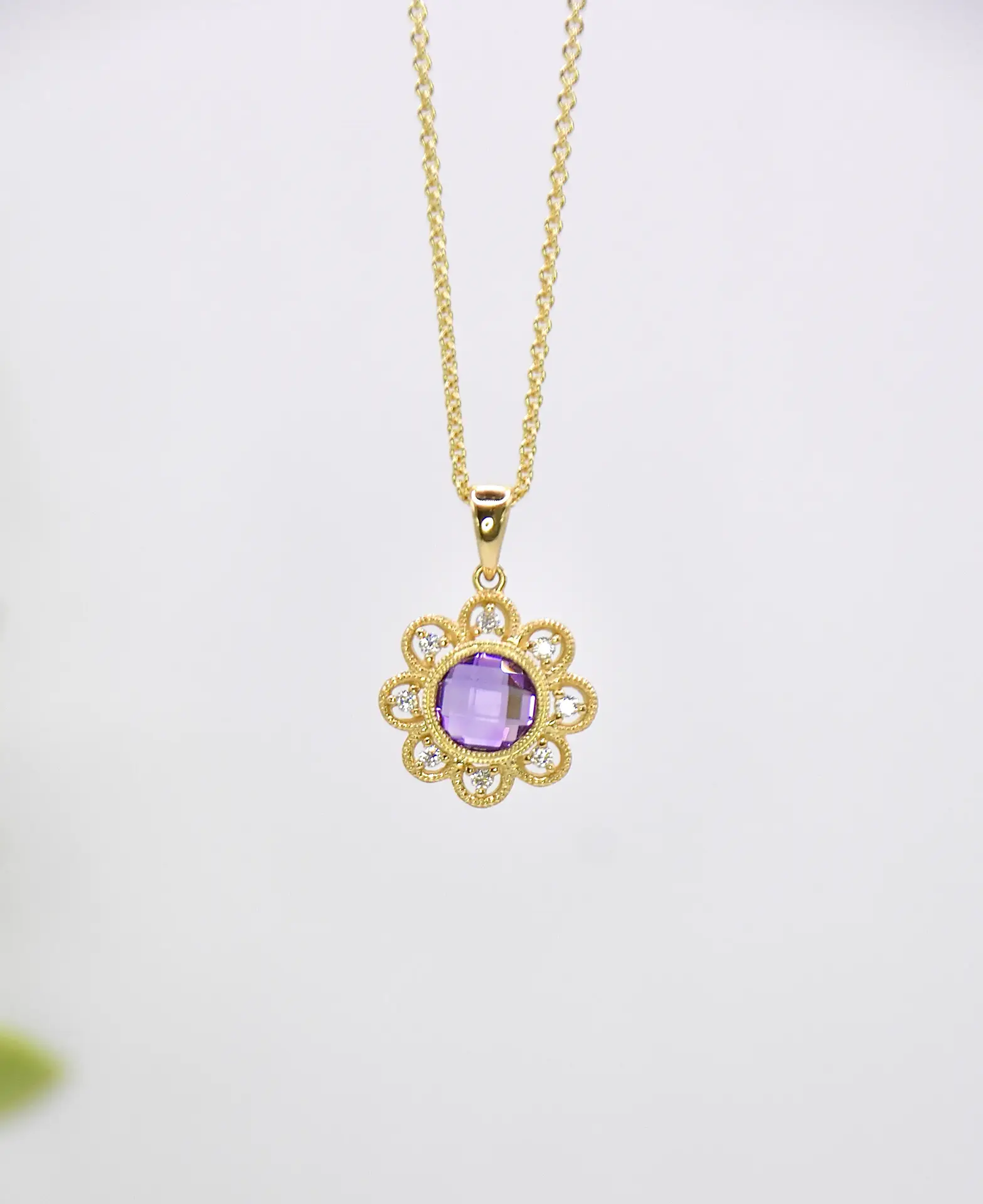 - 200-00542 14kt yellow gold amethyst ring surrounded by a halo of diamonds