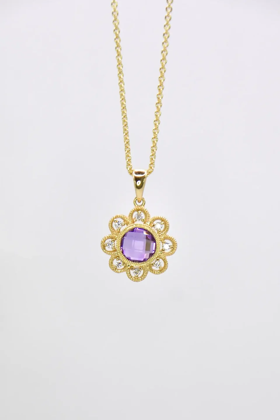 - 200-00542 14kt yellow gold amethyst ring surrounded by a halo of diamonds